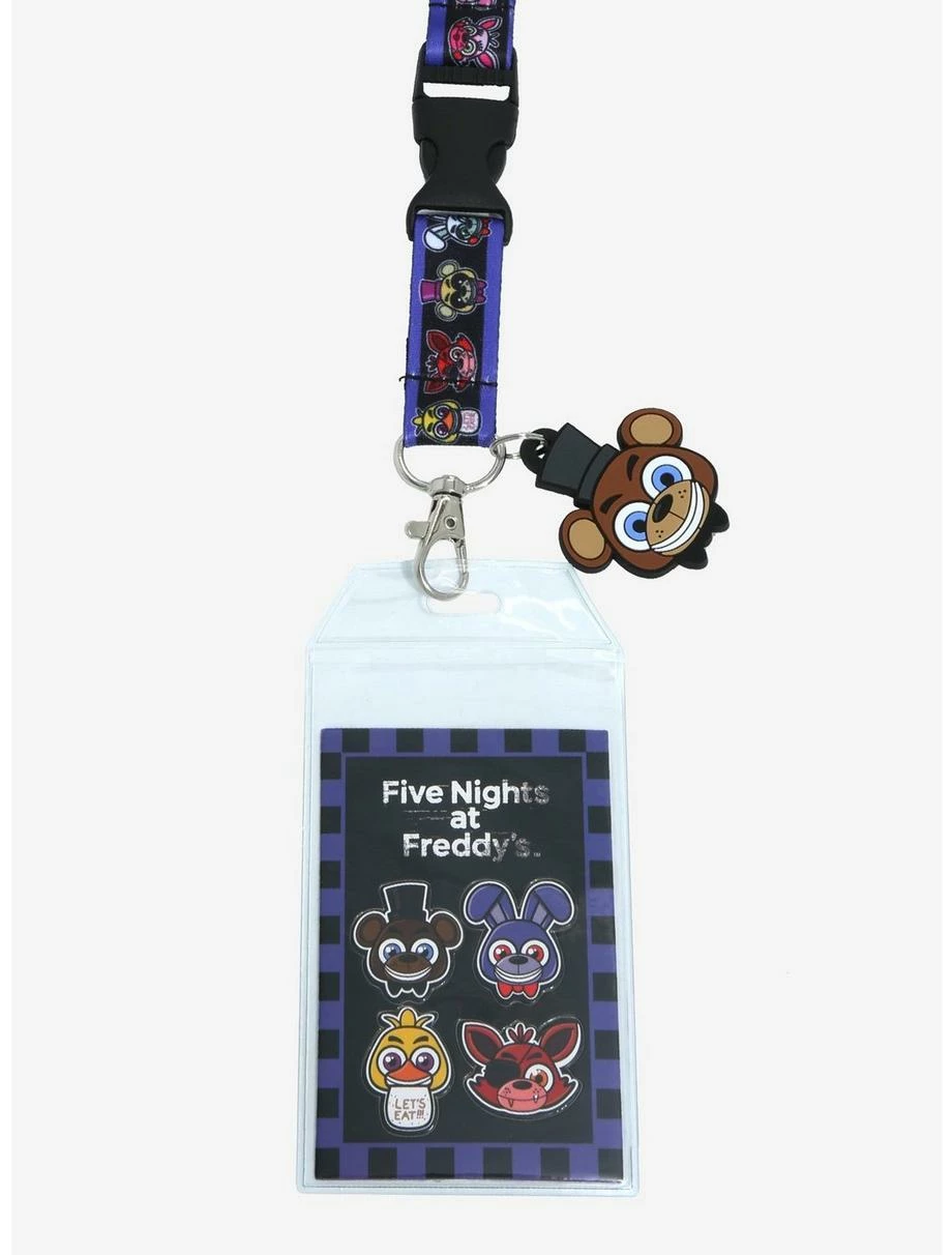 Freddy Fazbear, Chica, and more favorites from Five Nights at Freddy’s are here to watch over you and your ID, key cards, and more as the allover print chibi design of this lanyard. Also includes a die-cut silicone Freddy charm and sticker set.